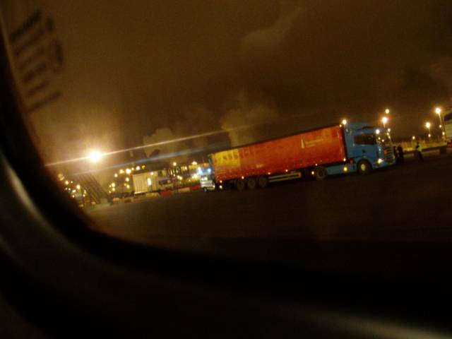 17 kB, Přístav v Calais. Modrý majáčky jsou tam proto, že v kamionu našli uprchlíky.
