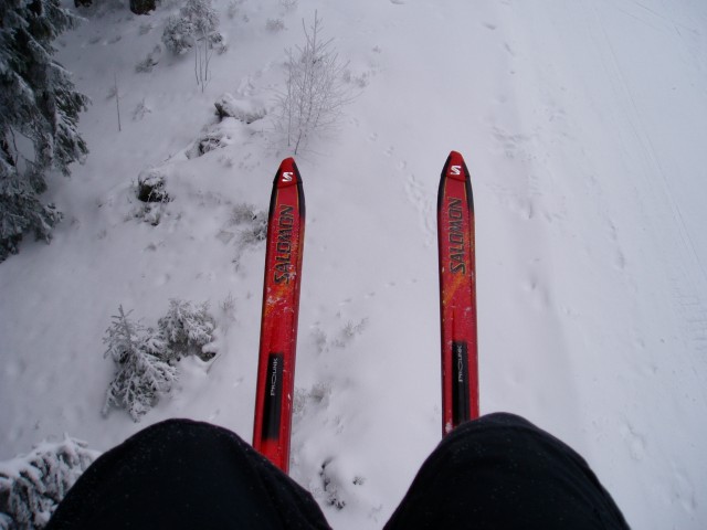 47 kB, Jsem si vyfotil půjčené 195cm dlouhé lyže, abych věděl co mám hledat až mi ujedou